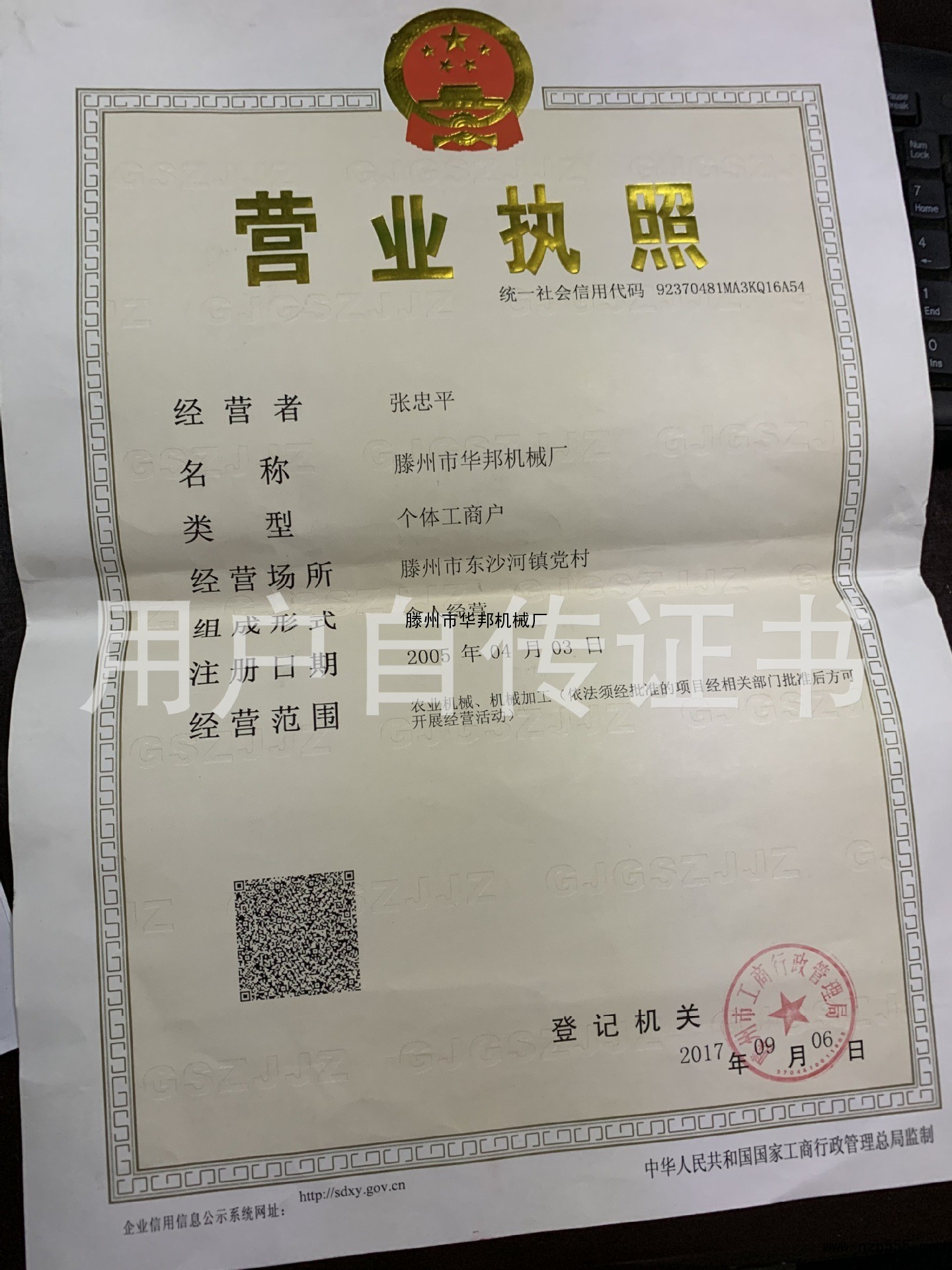 | 發(fā)證機(jī)構(gòu): | 滕州市工商行政管理局 | 發(fā)證時(shí)間 : | 2017-09-06 |