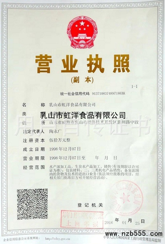 榮譽(yù)資質(zhì) 乳山市虹洋食品有限公司
