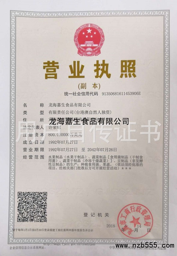 | 發(fā)證機(jī)構(gòu): | 龍海市工商行政管理局 | 發(fā)證時(shí)間 : | 2018-06-14 |
