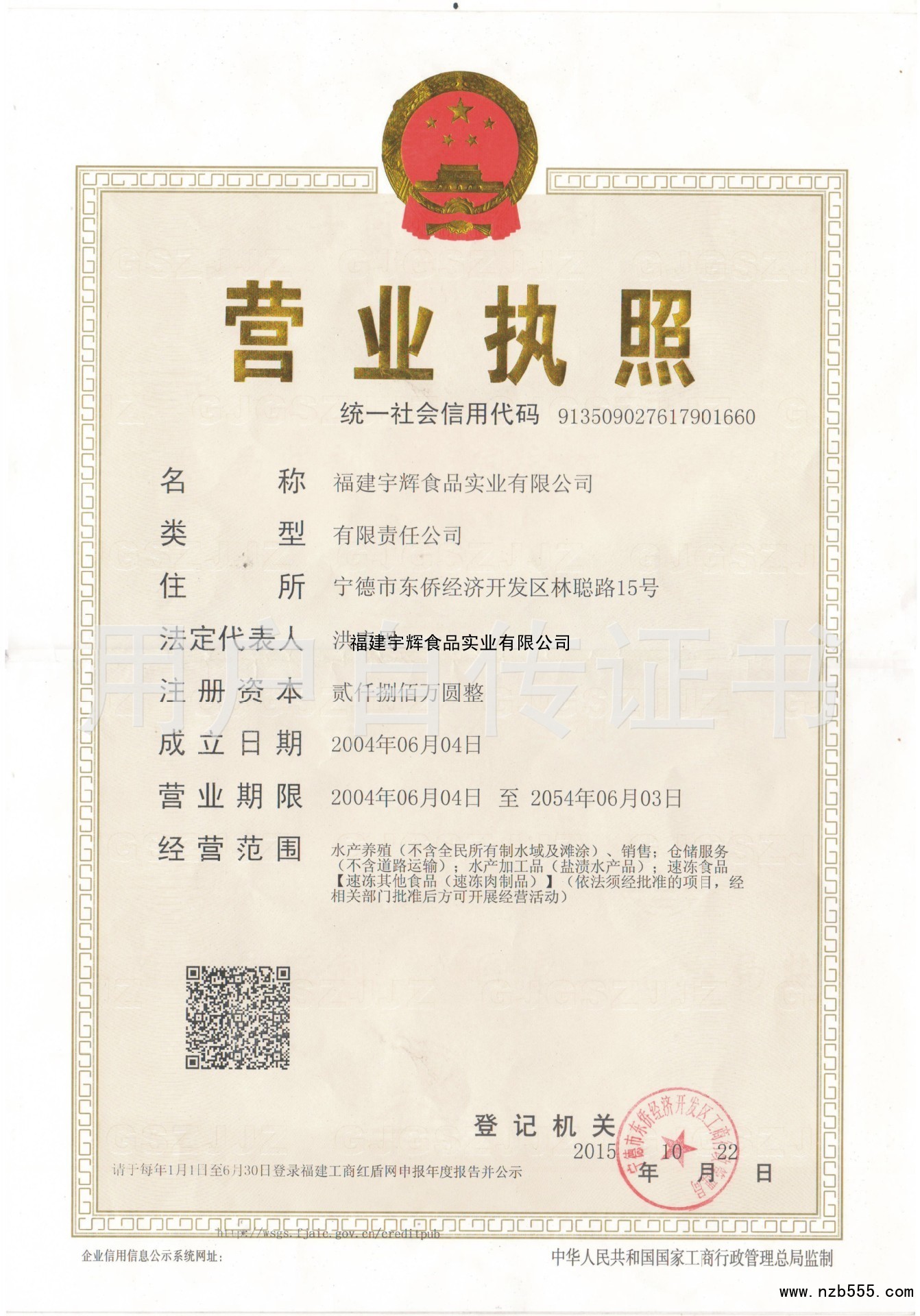 | 發(fā)證機(jī)構(gòu): | 寧德市東僑經(jīng)濟(jì)開(kāi)發(fā)區(qū)工商行政管理局 | 發(fā)證時(shí)間 : | 2015-10-22 |