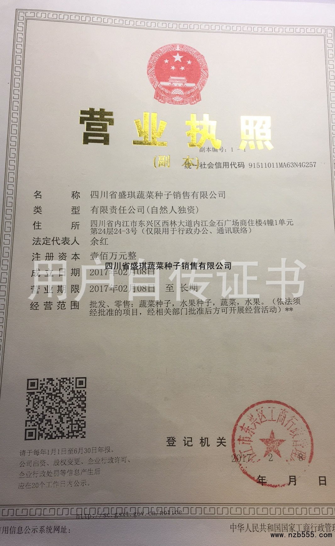 | 發(fā)證機(jī)構(gòu): | 內(nèi)江市東興區(qū)工商行政管理局 | 發(fā)證時(shí)間 : | 2017-02-08 |