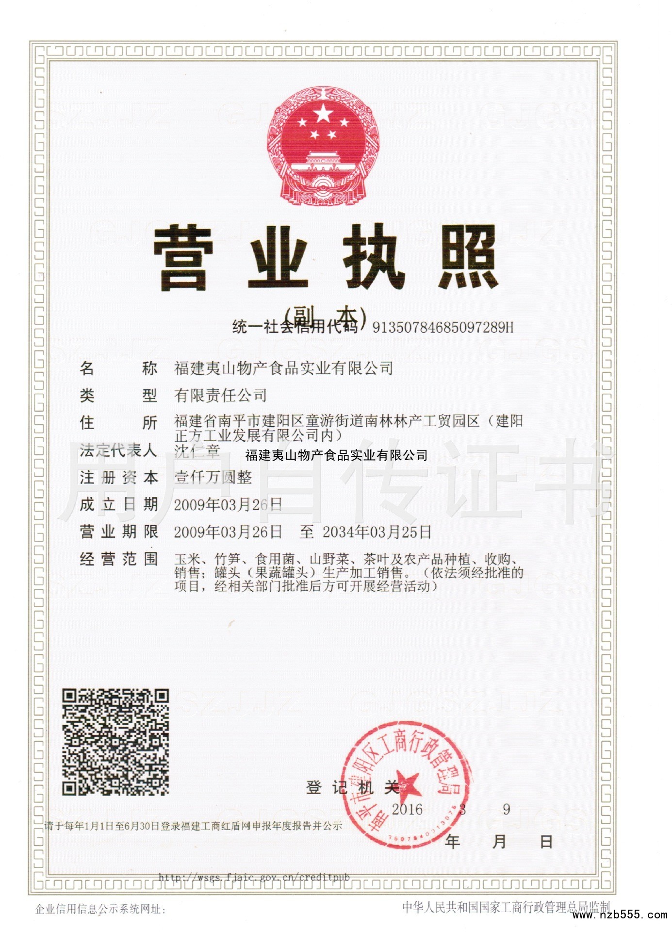 | 發(fā)證機(jī)構(gòu): | 南平市建陽區(qū)工商行政管理局 | 發(fā)證時(shí)間 : | 2016-03-09 |