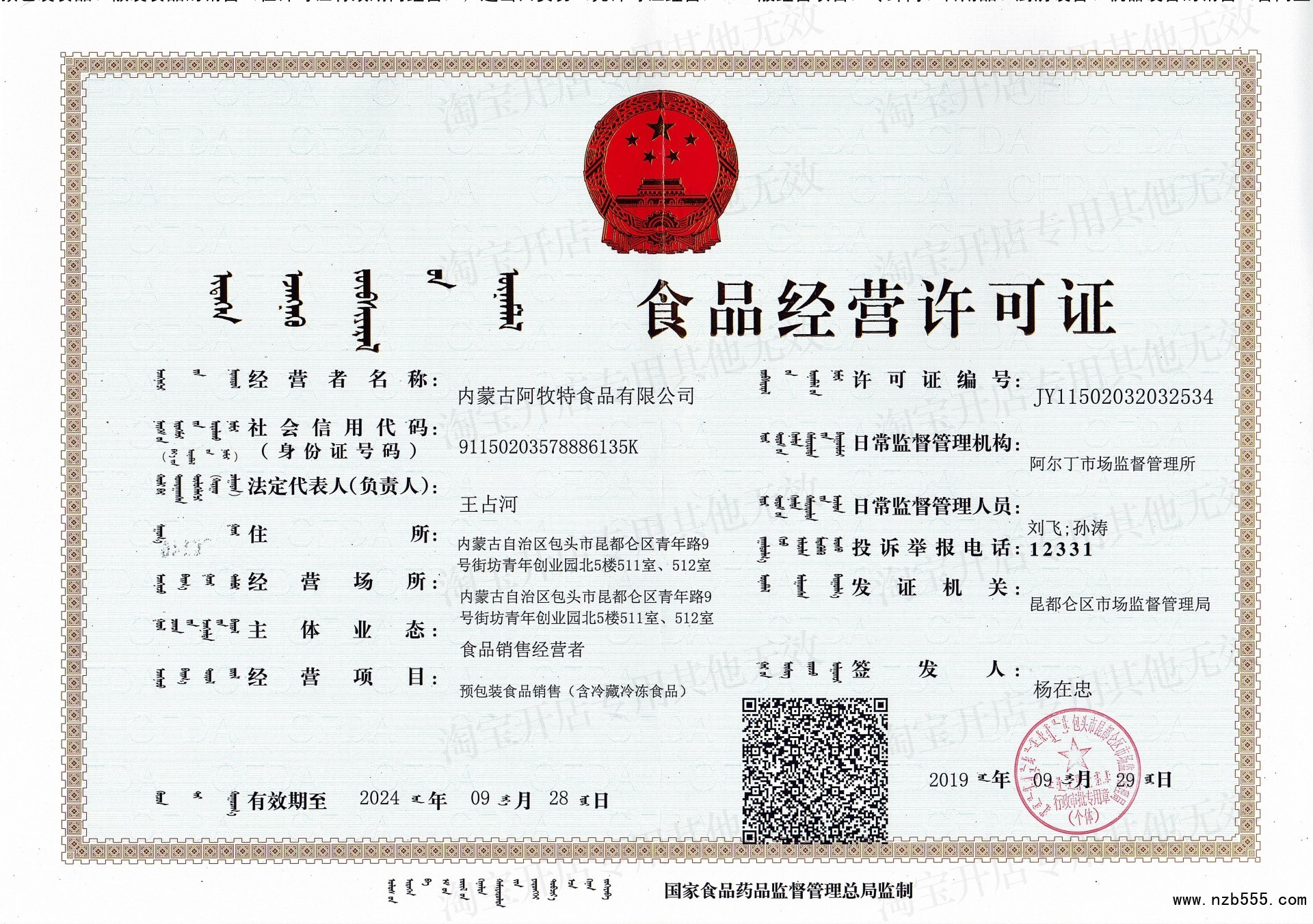 預包裝食品、散裝食品的銷售(在許可證有效期內經營);進出口貿易(憑許可證經營...