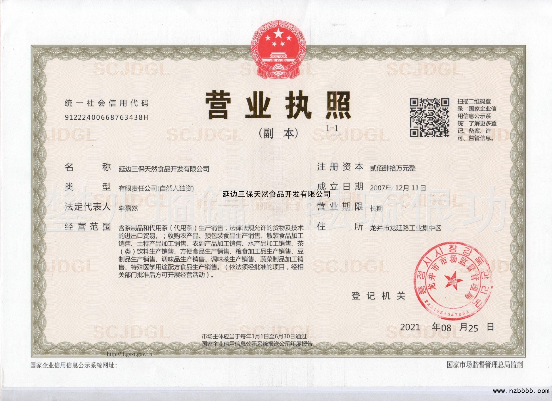 | 發(fā)證機(jī)構(gòu): | 龍井市市場(chǎng)監(jiān)督管理局 | 發(fā)證時(shí)間 : | 2021-08-25 |
