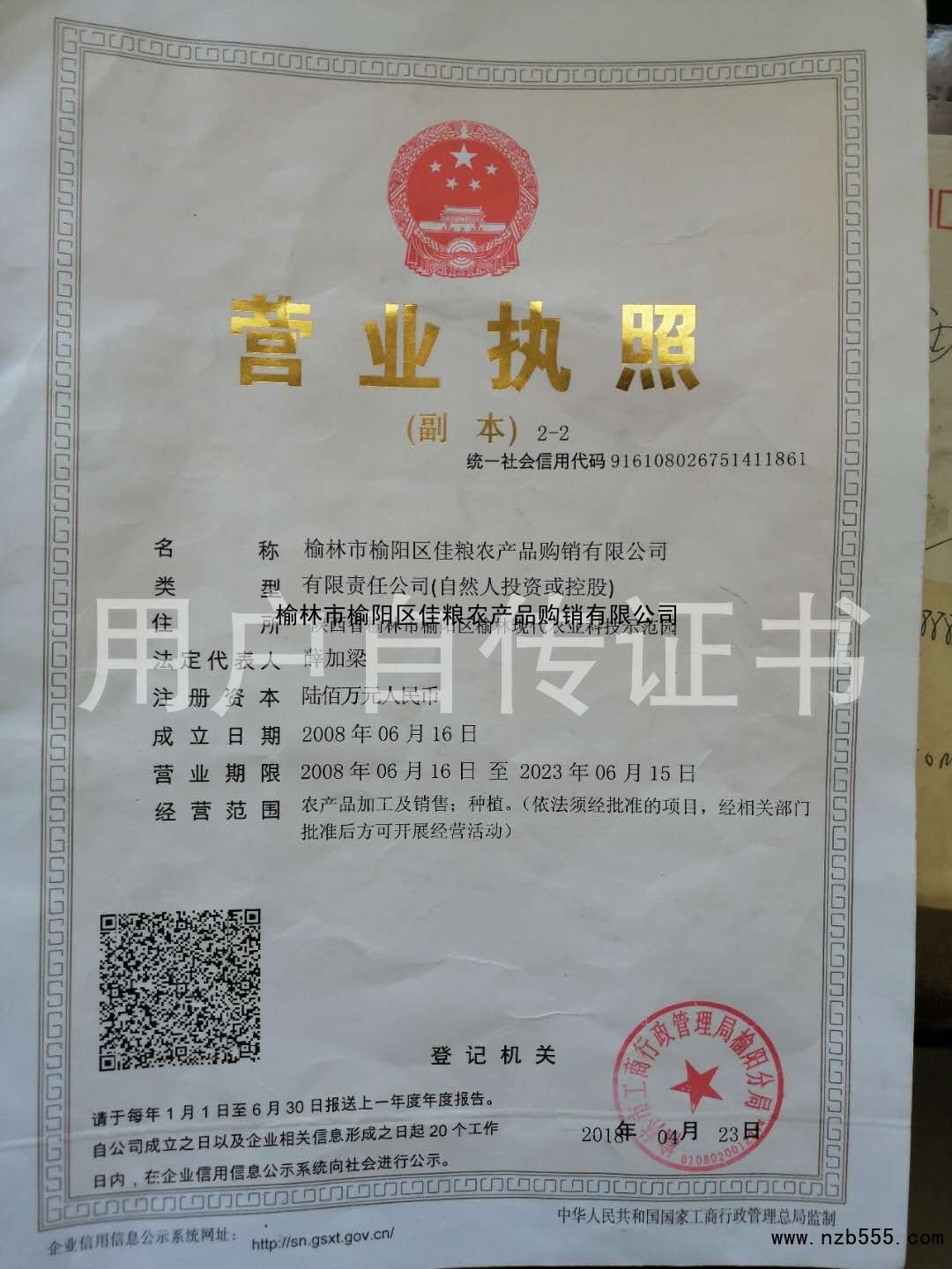 | 發(fā)證機(jī)構(gòu): | 榆林市工商行政管理局榆陽分局 | 發(fā)證時(shí)間 : | 2018-04-23 |