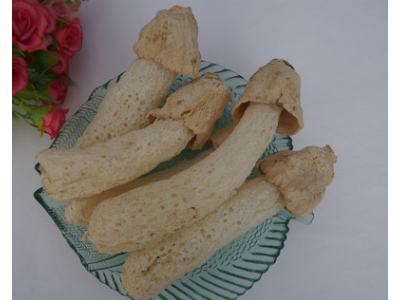 二、將干竹蓀50g用溫水泡10分鐘、洗凈,把切成很碎并加有鹽和味精的細(xì)豬肉放入竹蓀的空心中,一條條擺好,蒸25分鐘后,等50℃時切成方塊即可食用。
